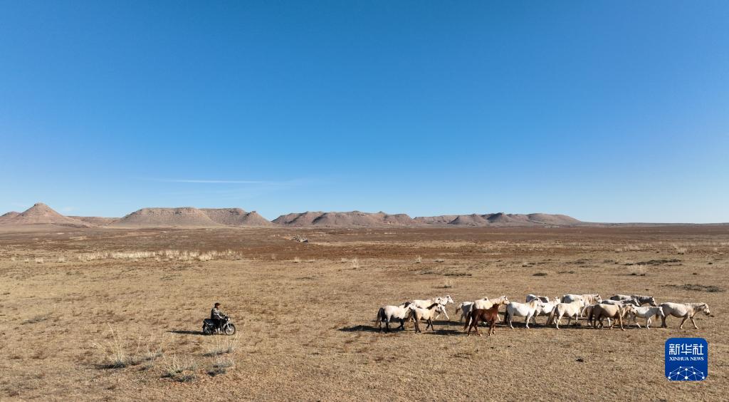 金秋時(shí)節(jié),天氣轉(zhuǎn)涼,鄂爾多斯草原上一片金黃。牧民道爾吉騎著摩托車(chē)在草原上驅(qū)趕馬群,開(kāi)始忙碌的一天。飲馬、趕羊是這個(gè)季節(jié)每天的工作。