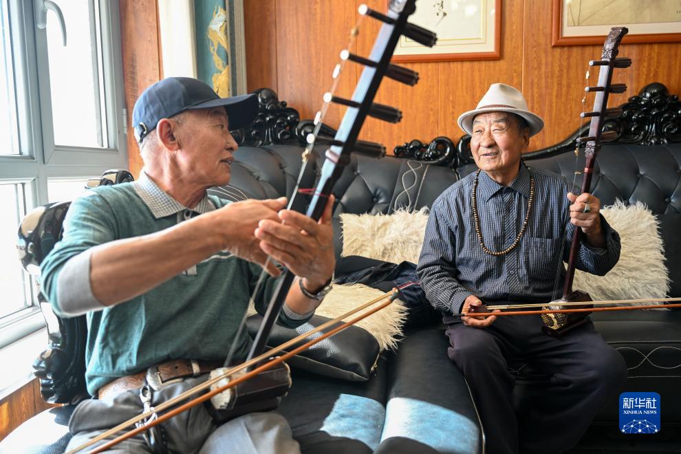 道爾吉的父親明安寶已經(jīng)91歲,曾經(jīng)是當(dāng)?shù)氐泥l(xiāng)村醫(yī)生、鄉(xiāng)鎮(zhèn)衛(wèi)生院院長。2018年,明安寶組織周邊老人一同組建了老年人“乃日”樂隊(duì),他們定期排練并參加各項(xiàng)演出活動,在傳承“乃日”文化的同時,也豐富了牧區(qū)老年人的精神文化生活。明安寶說:“自從有了這個樂隊(duì),我們有空就一起練習(xí),比原來打麻將有意思多了。我以前通過看病治愈人們的身體,現(xiàn)在我們一起用‘乃日’文化‘治愈’大家的精神生活。”