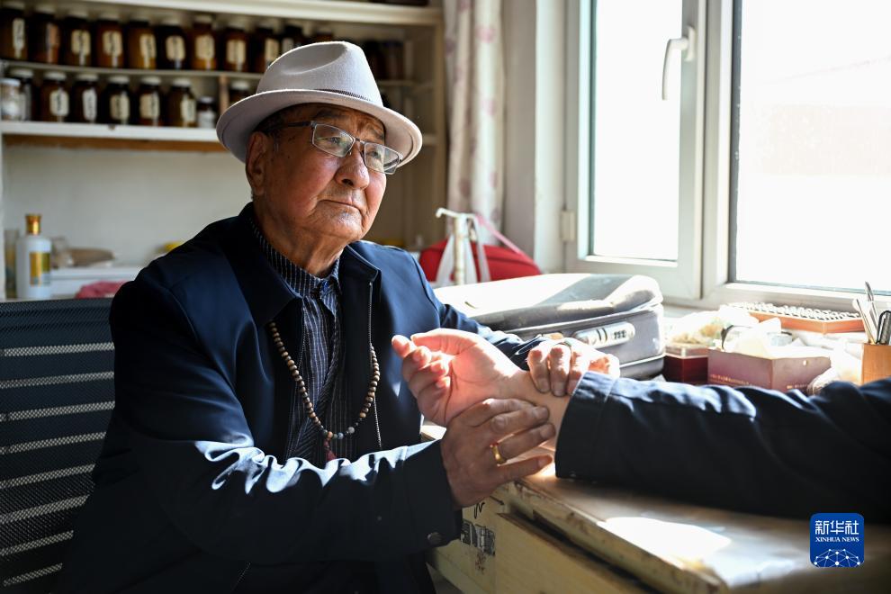 10月16日,明安寶在家中為牧民把脈。