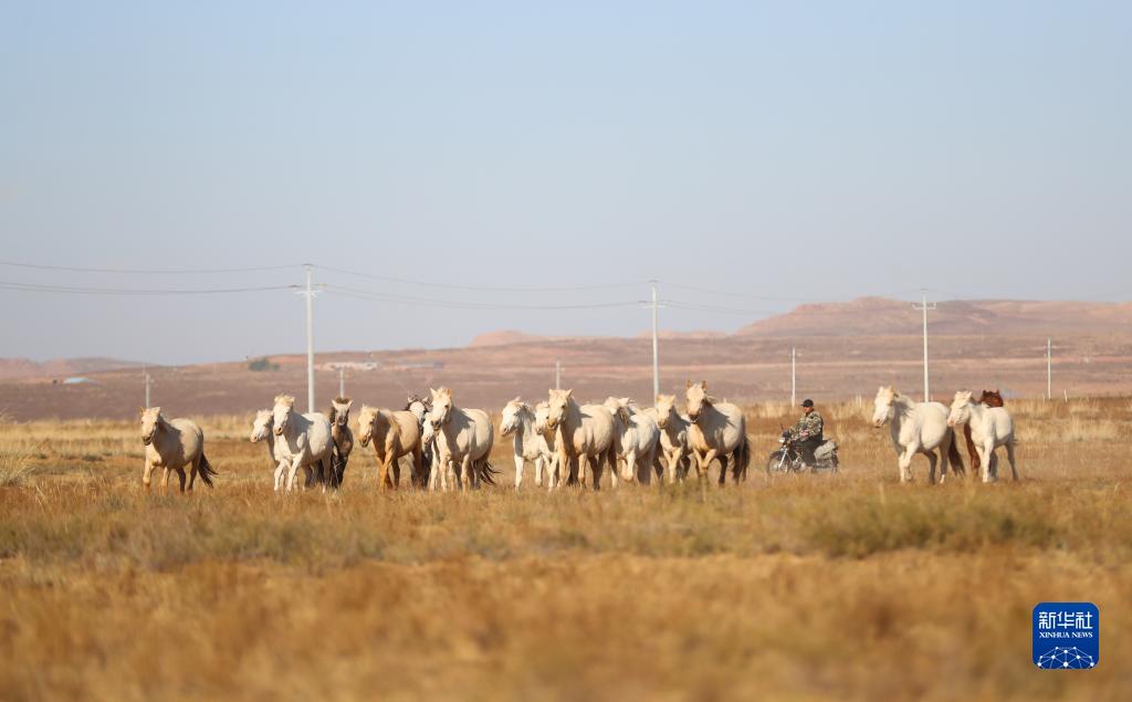 金秋時節,天氣轉涼,鄂爾多斯草原上一片金黃。牧民道爾吉騎著摩托車在草原上驅趕馬群,開始忙碌的一天。飲馬、趕羊是這個季節每天的工作。