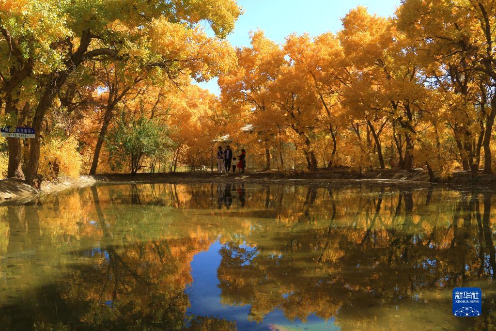 10月17日,游客在甘肅省敦煌市莫高鎮(zhèn)的胡楊林中賞景。