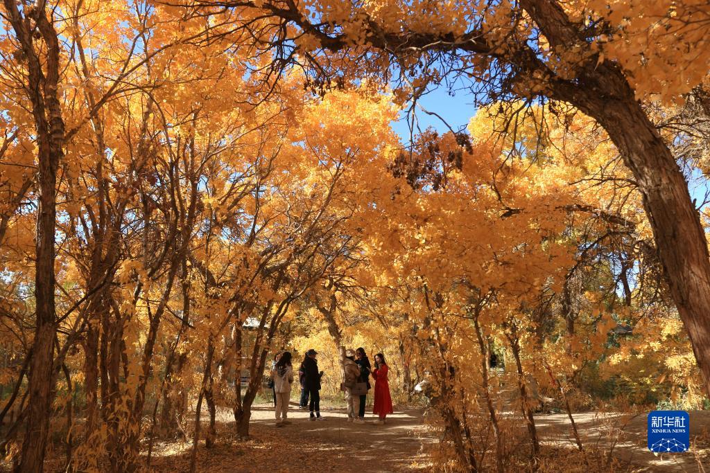 10月17日,游客在甘肅省敦煌市莫高鎮的胡楊林中賞景。