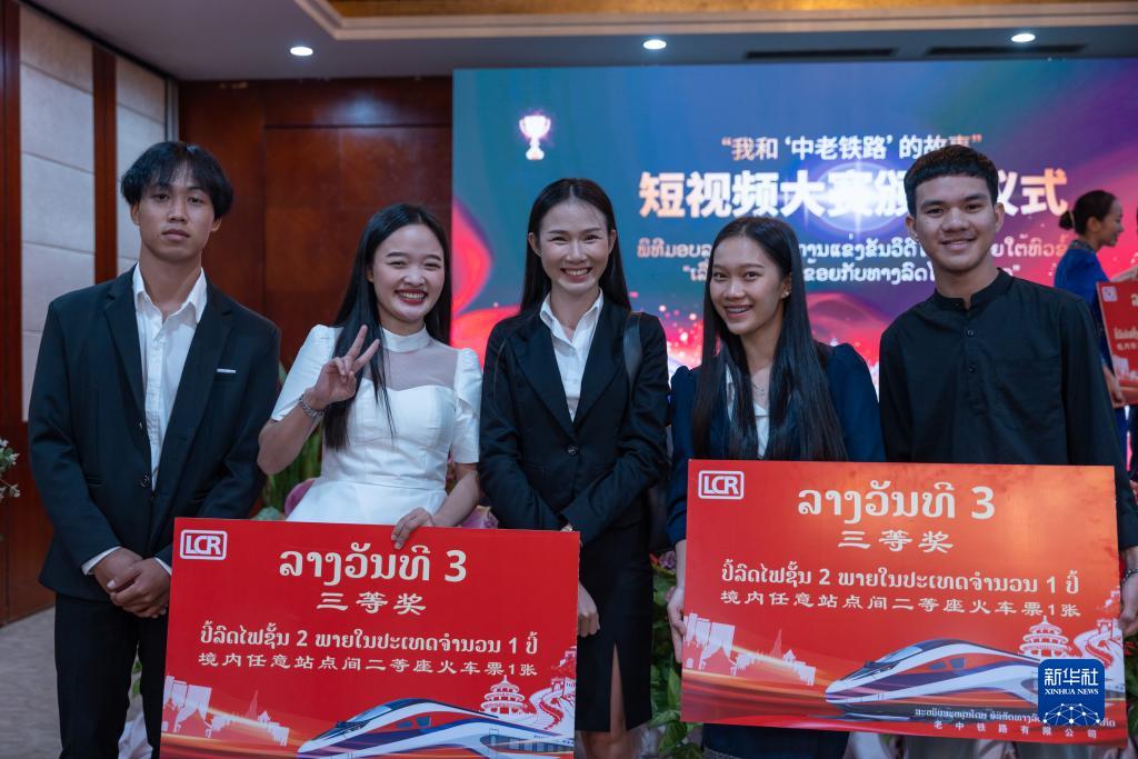 由中國駐老撾大使館舉辦的“我和‘中老鐵路’的故事”短視頻大賽16日在老撾首都萬象舉行頒獎儀式。老撾新聞文化旅游部副部長萬西與中國駐老撾大使館臨時代辦王暢共同為獲獎者頒獎。