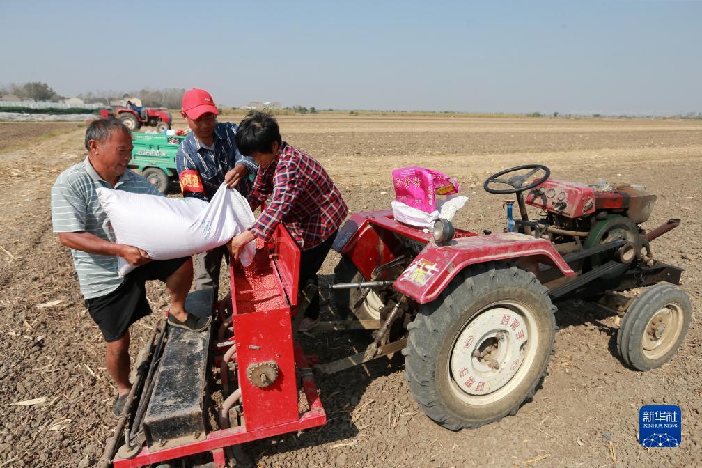10月17日,在淮北市濉溪縣雙溝村,農(nóng)民為播種機(jī)添加小麥種子。