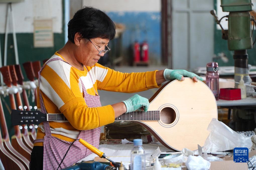 10月17日,在山東省昌樂縣鄌郚鎮(zhèn)的一家樂器生產(chǎn)企業(yè),一名工作人員在制作樂器布祖基琴。