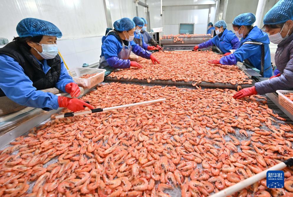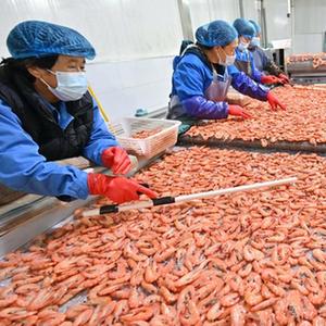 10月17日,工人在河北省唐山市曹妃甸區一家水產加工企業的南美白對蝦加工生產線上工作。