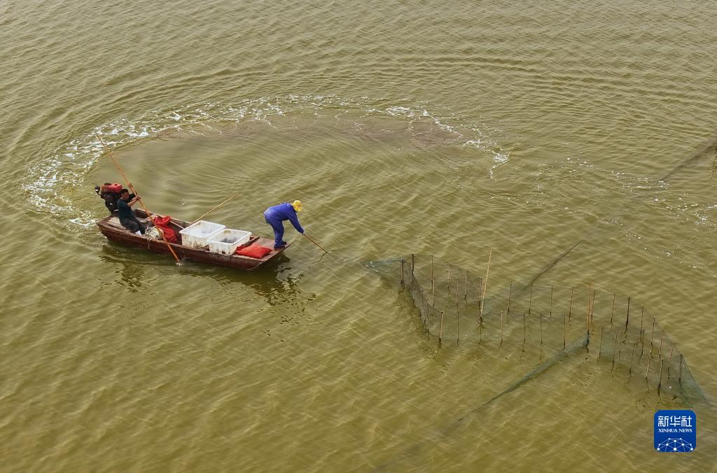 10月17日,在河北省唐山市曹妃甸區,水產養殖戶在捕撈利用鹽場鹽田鹵水養殖的南美白對蝦(無人機照片)。