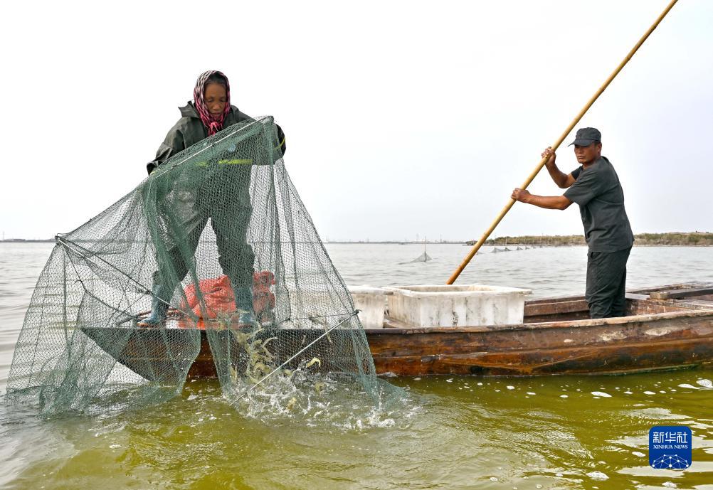 10月17日,在河北省唐山市曹妃甸區(qū),水產(chǎn)養(yǎng)殖戶在捕撈利用鹽場(chǎng)鹽田鹵水養(yǎng)殖的南美白對(duì)蝦。