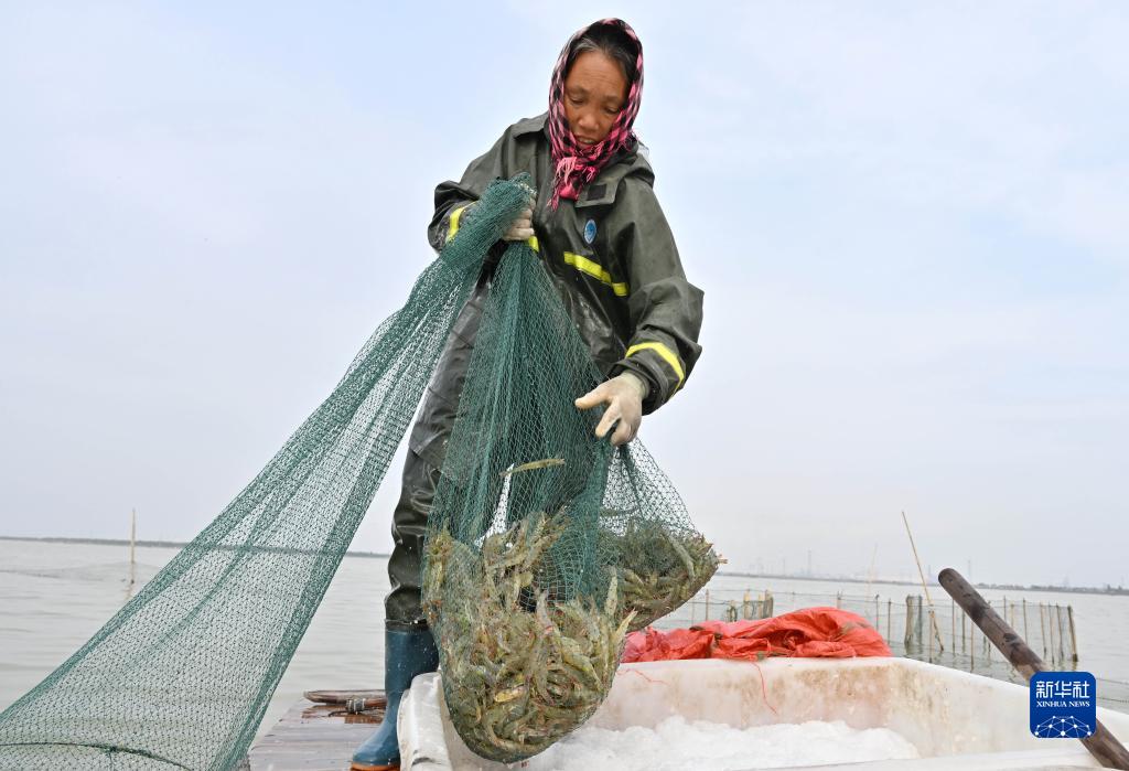 10月17日,在河北省唐山市曹妃甸區,水產養殖戶在捕撈利用鹽場鹽田鹵水養殖的南美白對蝦。