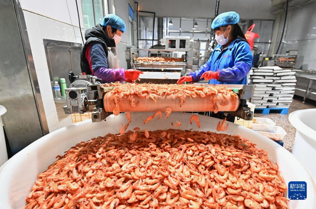 10月17日,工人在河北省唐山市曹妃甸區(qū)一家水產(chǎn)加工企業(yè)的南美白對蝦加工生產(chǎn)線上工作。