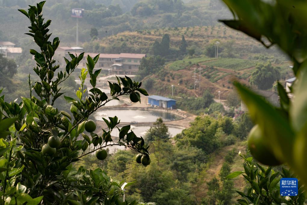 10月17日,在位于四川資中縣銀山鎮的橙堡魚鄉融合發展示范園,血橙已經掛果,遠處可見用于鯰魚養殖的魚池。