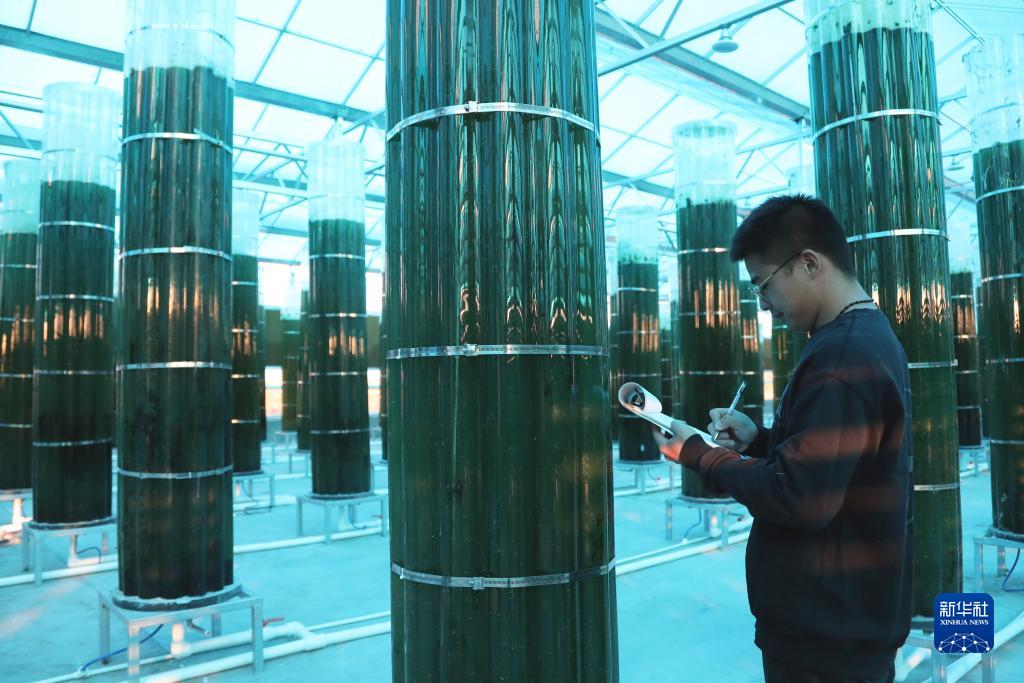 10月17日,園區(qū)工作人員在查看柱式養(yǎng)殖的螺旋藻情況。