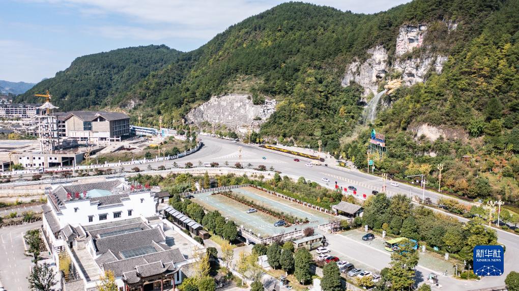 新能源汽車在黔南布依族苗族自治州龍里縣龍山鎮的充電樁設施充電(圖右下)(10月17日攝,無人機照片)。