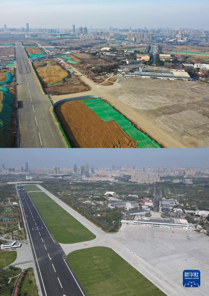 這是一張拼版照片:上圖為2021年2月9日拍攝的已停用的合肥駱崗機場(無人機照片,新華社發 黃洋洋攝);下圖為2023年10月17日拍攝的合肥駱崗公園(無人機照片,新華社記者周牧攝)。