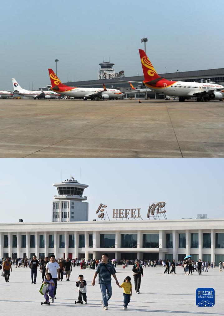 這是一張拼版照片:上圖為2013年5月24日,客機停在合肥駱崗機場停機坪上(新華社發(fā) 黃洋洋攝);下圖為2023年9月30日,游客在合肥駱崗公園參觀(新華社記者周牧攝)。