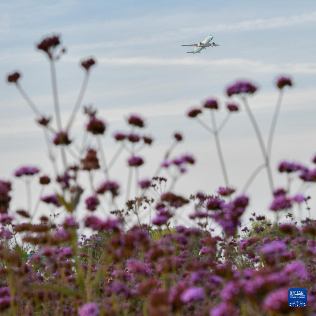 這是10月16日在蘭州新區臨港花海拍攝的一架飛機從蘭州中川國際機場起飛。