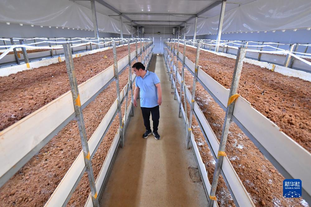 10月18日,在湘潭市雨湖區姜畬鎮白鷺湖村,村民在一個由閑置農房改造而成的“5G智慧小菇房”里查看食用菌生長情況。