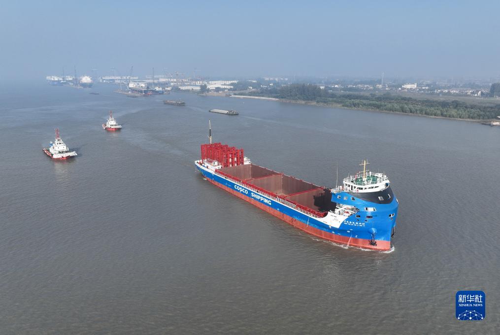10月18日,中遠海運萬噸級電動集裝箱船在長江試航(無人機照片)。