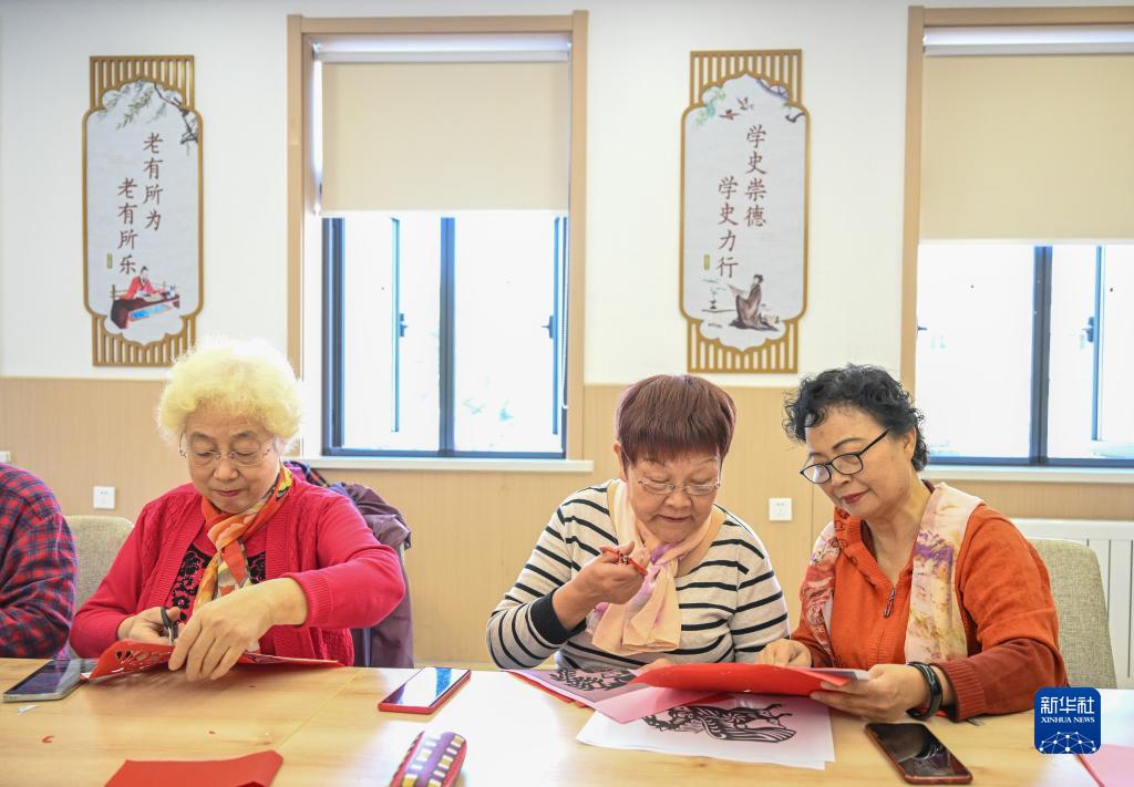 10月17日,老年人在天津市河西區(qū)越秀路街道居家養(yǎng)老服務(wù)中心進(jìn)行剪紙手工創(chuàng)作。