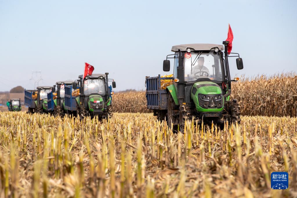 10月18日,在黑龍江省綏化市北林區張維鎮潤地農業種植合作社的一處玉米地,拖拉機運輸剛剛收獲的玉米。