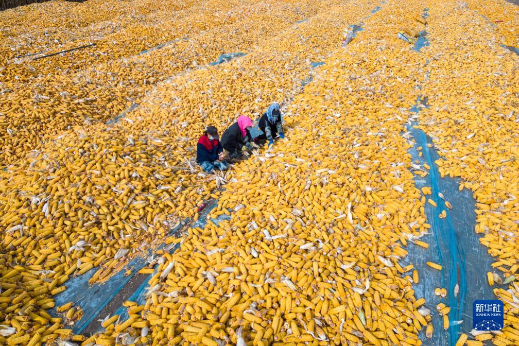 10月18日,村民在綏化市北林區張維鎮潤地農業種植合作社晾曬場整理玉米(無人機照片)。