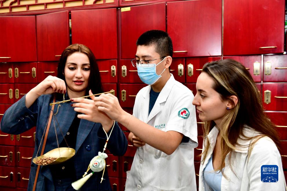 10月18日,在青島西海岸新區(qū)中醫(yī)醫(yī)院,山東科技大學(xué)國際交流學(xué)院伊朗籍留學(xué)生哈畀蒂(左一)在體驗中藥稱重。
