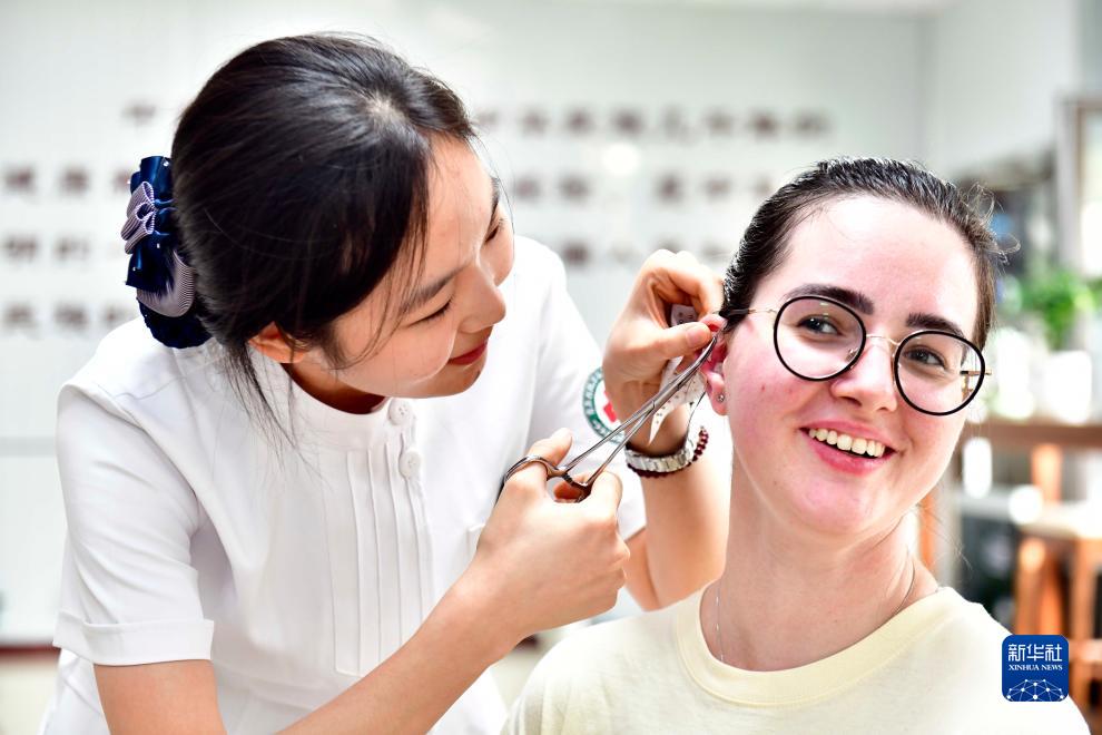 10月18日,在青島西海岸新區(qū)中醫(yī)醫(yī)院,山東科技大學(xué)國(guó)際交流學(xué)院斯洛伐克籍留學(xué)生夢(mèng)娜在體驗(yàn)中醫(yī)傳統(tǒng)療法耳穴壓丸。