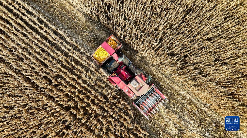 10月18日,在鄂爾多斯市達拉特旗展旦召蘇木柳林村,農(nóng)民駕駛農(nóng)機收割玉米(無人機照片)。