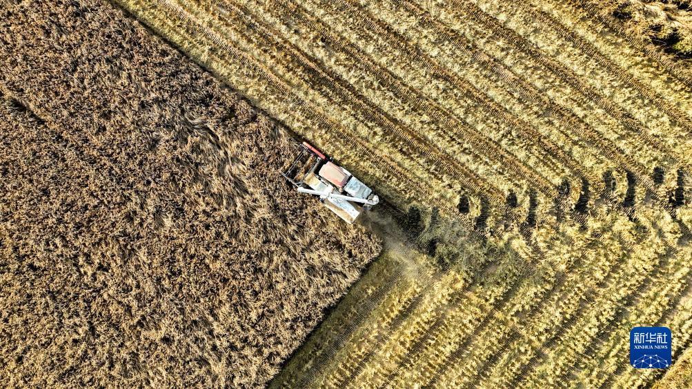 10月18日,在鄂爾多斯市達(dá)拉特旗昭君鎮(zhèn)沙圪堵村,農(nóng)民駕駛農(nóng)機(jī)收割水稻(無(wú)人機(jī)照片)。