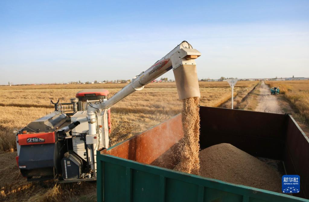 10月18日,在鄂爾多斯市達拉特旗昭君鎮沙圪堵村,農民將水稻裝入運糧車。