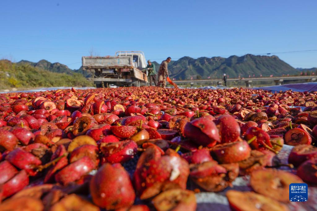 10月18日,農民在河北省遵化市一家果品專業合作社曬場晾曬山楂干。