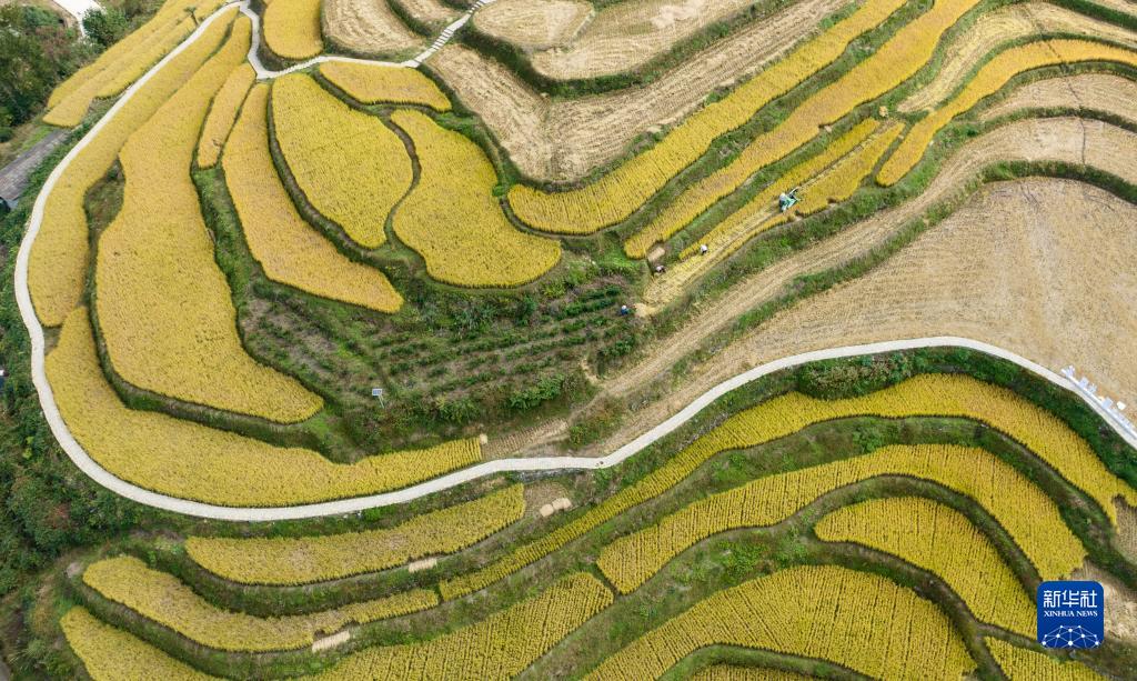 10月18日,村民在湖北省宜昌市秭歸縣長春村稻田里收割水稻(無人機照片)。