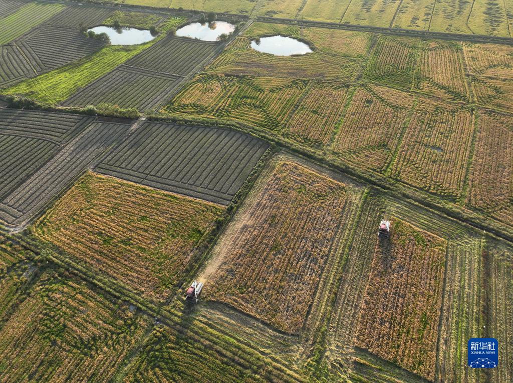 10月18日,湖南省衡陽市衡山縣白果鎮(zhèn),農(nóng)民在收割晚稻(無人機(jī)照片)。