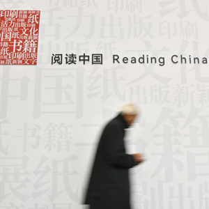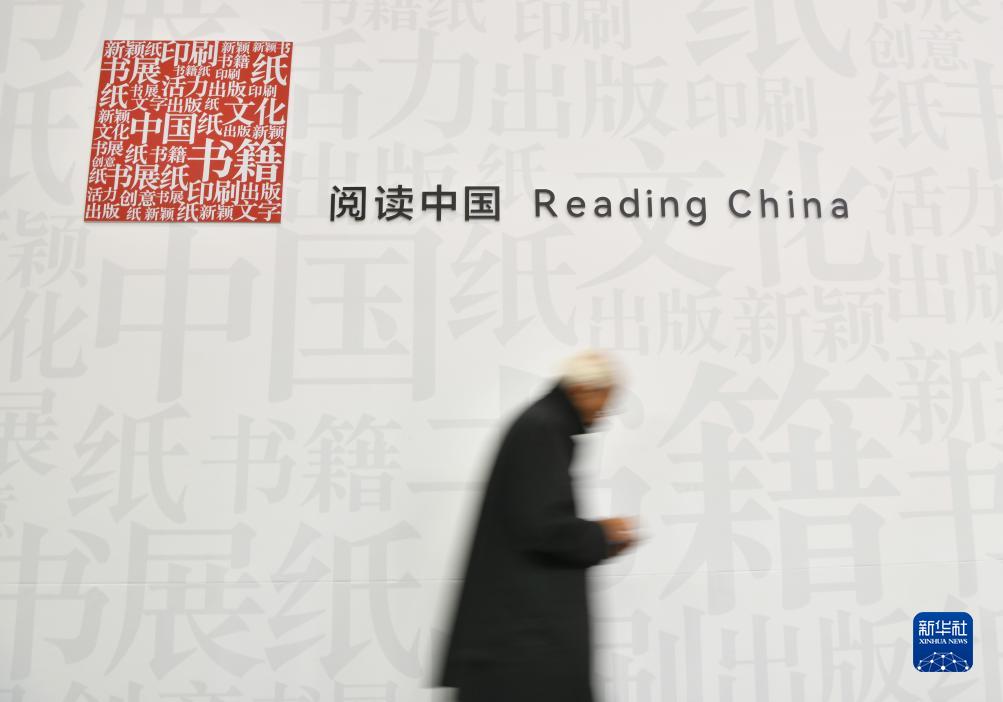 10月18日,一名參觀者經(jīng)過(guò)德國(guó)法蘭克福書(shū)展中國(guó)展區(qū)的展板。