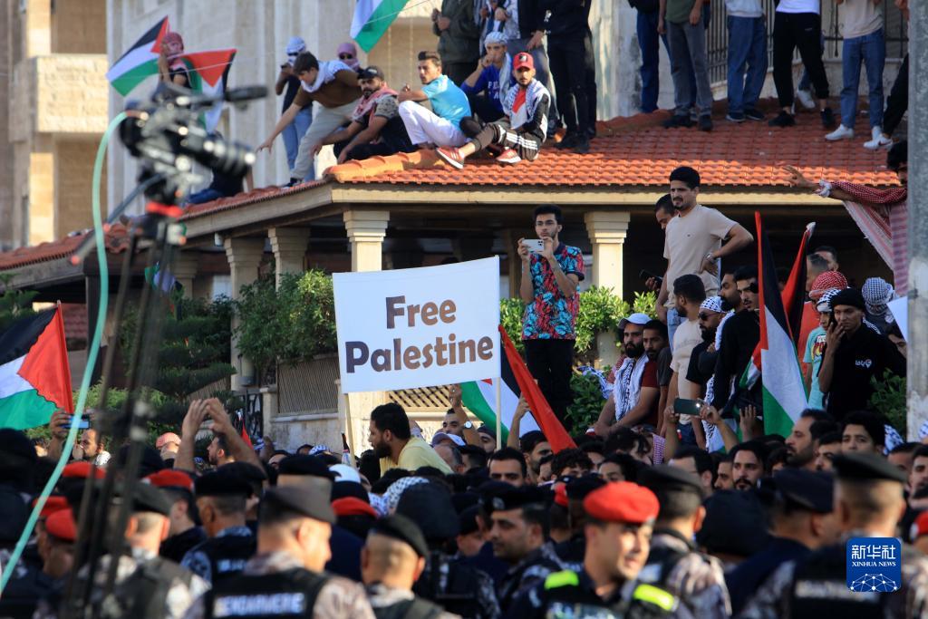 10月18日,人們在約旦安曼的以色列駐約旦大使館附近舉行集會。