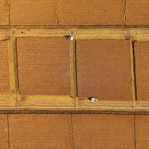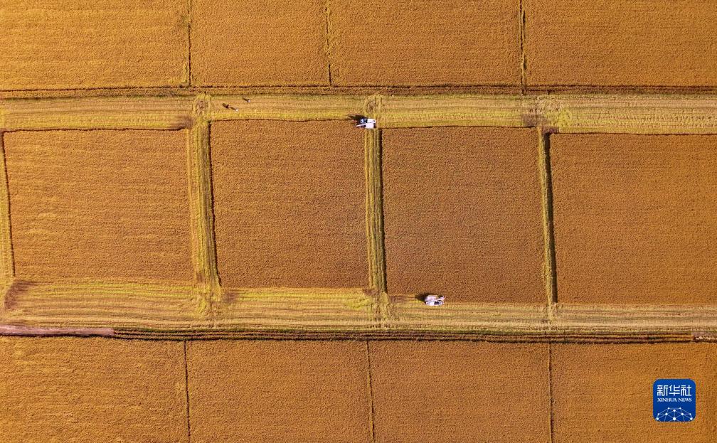 10月18日,在唐山市曹妃甸區(qū)第五農(nóng)場,農(nóng)機(jī)手操作收割機(jī)幫助農(nóng)民收割水稻(無人機(jī)照片)。