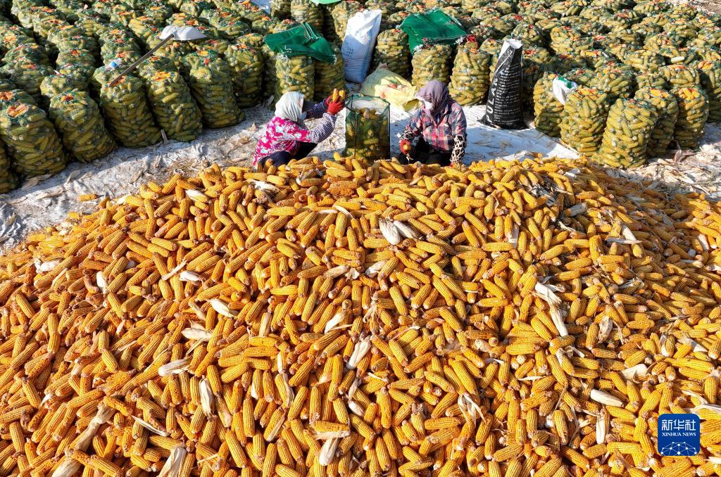 10月18日,唐山市豐南區王蘭莊鎮的農民將收獲的玉米裝袋、儲存(無人機照片)。