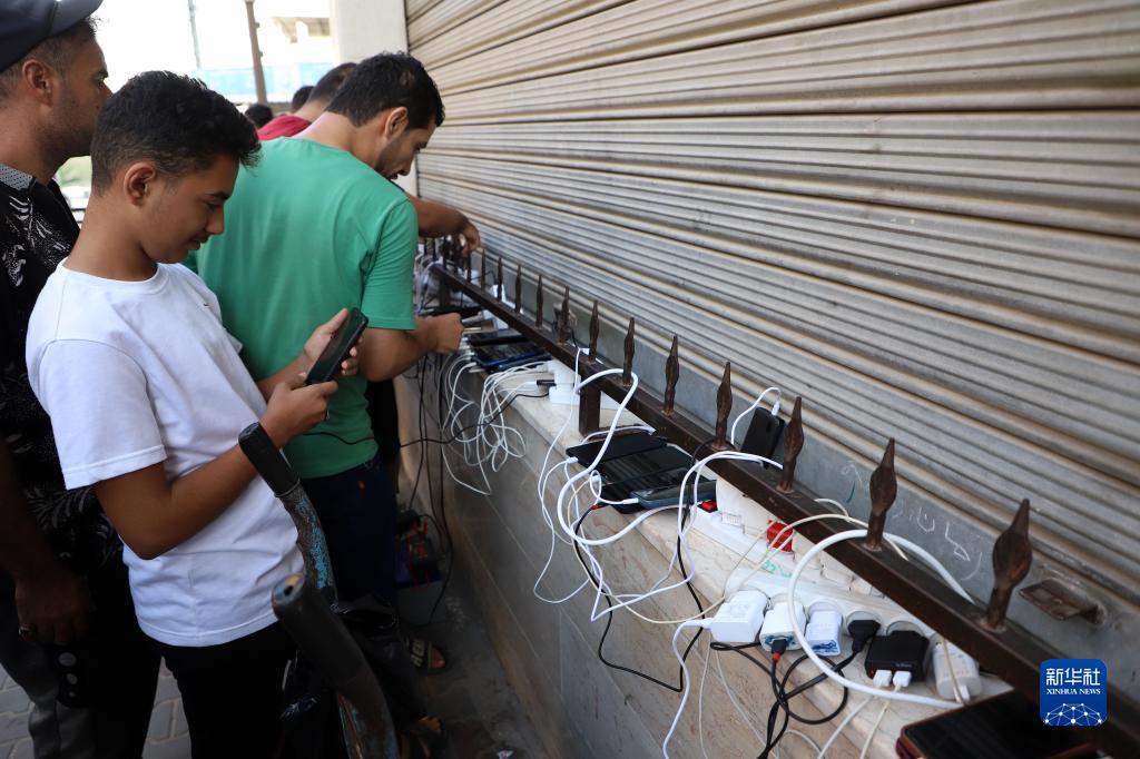 10月18日,在加沙地帶南部城市汗尤尼斯,人們給手機(jī)充電。