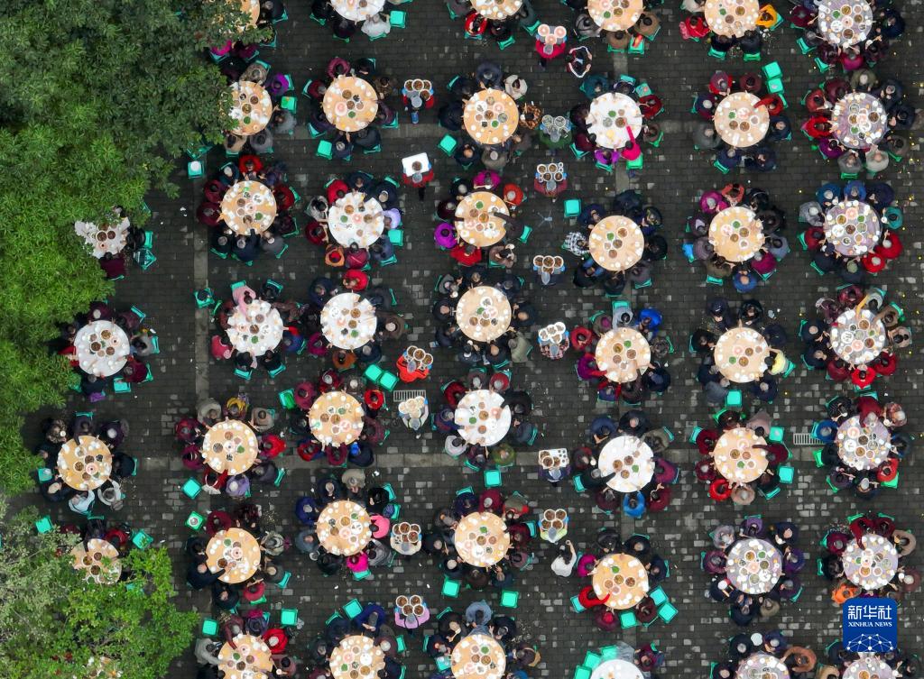10月19日拍攝的華巖鎮(zhèn)石龍社區(qū)“長壽宴”活動現(xiàn)場(無人機照片)。