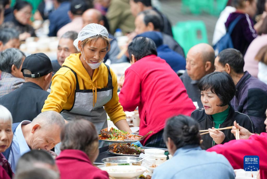 10月19日,重慶市九龍坡區華巖鎮石龍社區志愿者在為參加“長壽宴”的老人們上菜。