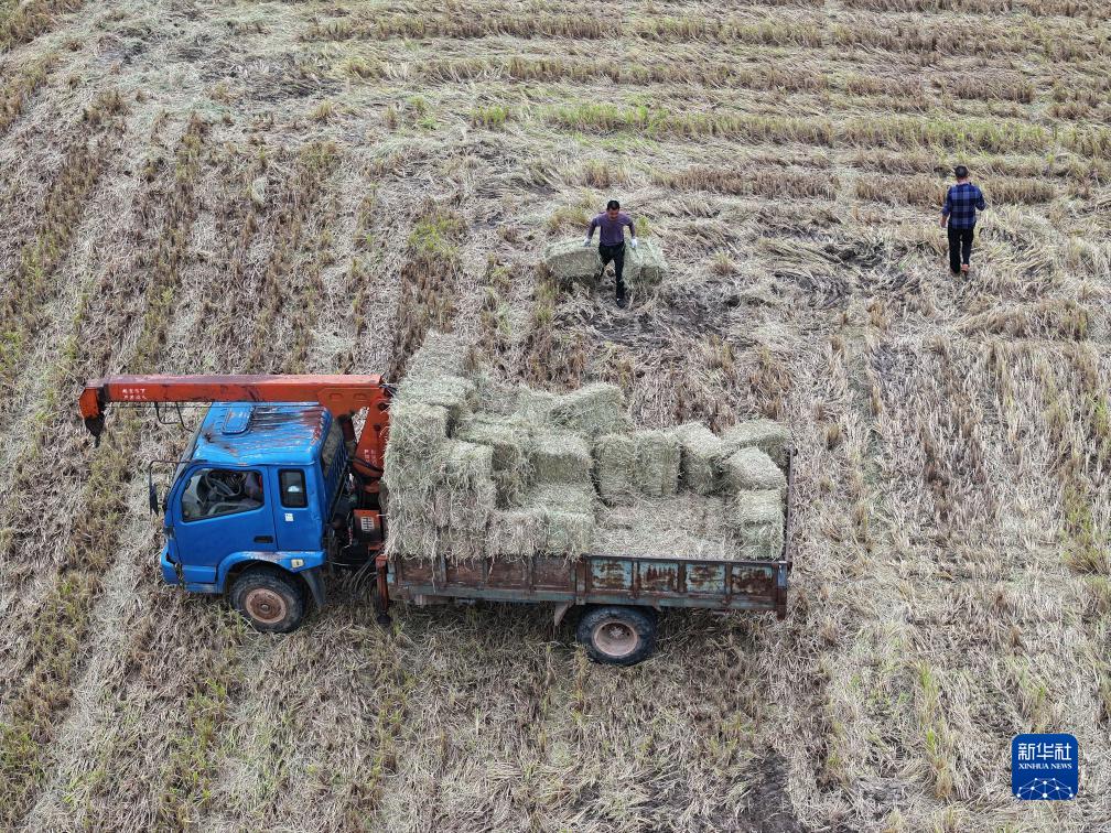 10月19日,在湖南省湘潭市雨湖區(qū)鶴嶺鎮(zhèn)晶鑫村,農(nóng)戶將已打捆的秸稈搬運(yùn)上車(無人機(jī)照片)。