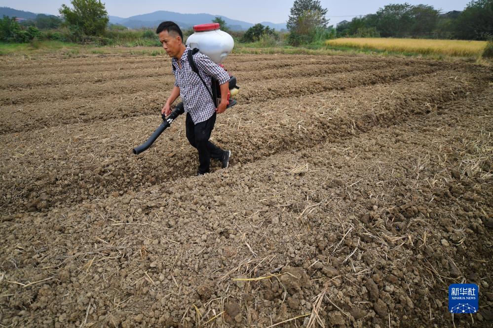 10月19日,在湖南省湘潭市雨湖區(qū)鶴嶺鎮(zhèn)晶鑫村,農(nóng)戶在田間播種油菜。