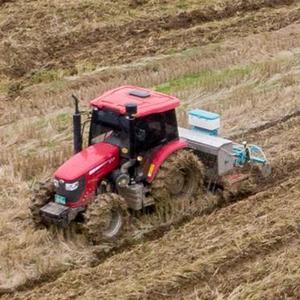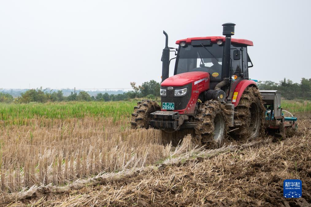 10月19日,在湖北省荊門市沙洋縣曾集鎮金雞村,五洋農機專業合作社社員操作機械設備播種油菜。