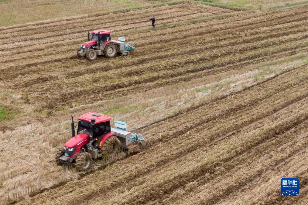 10月19日,在湖北省荊門市沙洋縣曾集鎮(zhèn)金雞村,五洋農(nóng)機專業(yè)合作社社員操作機械設(shè)備播種油菜(無人機照片)。