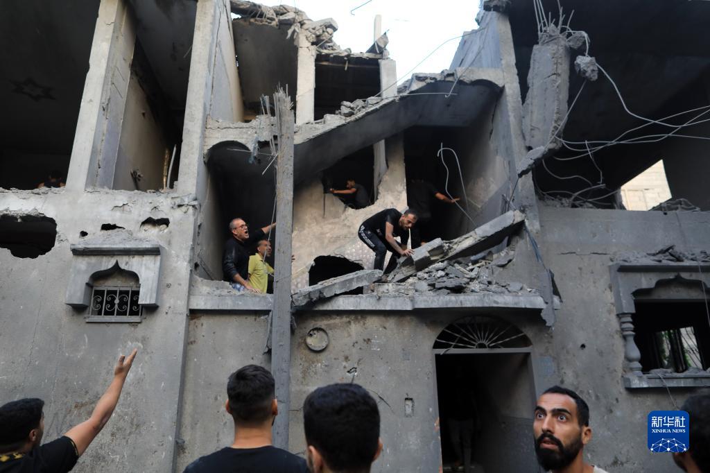 10月19日,在加沙地帶南部城市汗尤尼斯,人們在遭以色列空襲后的建筑廢墟中救援傷者。
