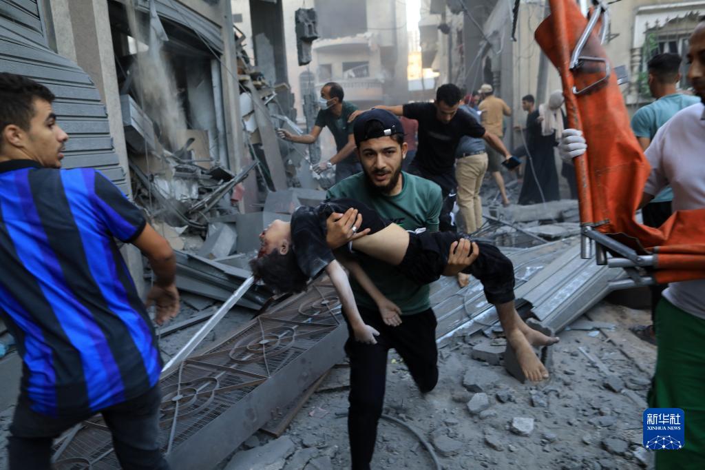 10月19日,在加沙地帶南部城市汗尤尼斯,人們在遭以色列空襲后的建筑廢墟中救援傷者。