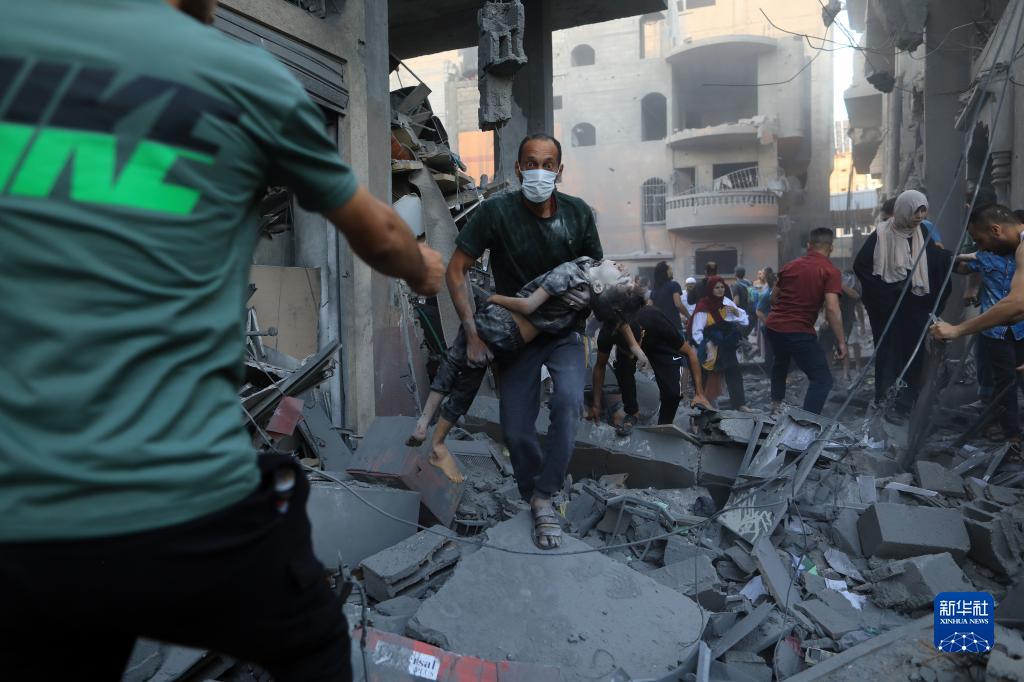 10月19日,在加沙地帶南部城市汗尤尼斯,人們在遭以色列空襲后的建筑廢墟中救援傷者。