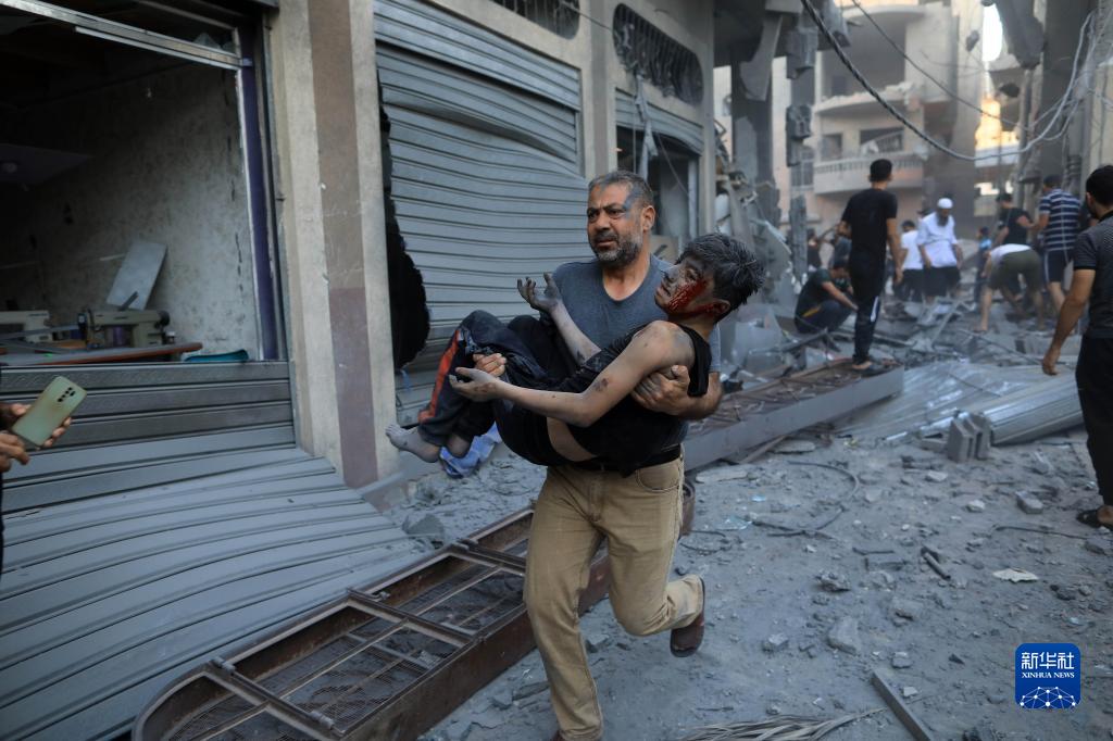 10月19日,在加沙地帶南部城市汗尤尼斯,人們在遭以色列空襲后的建筑廢墟中救援傷者。