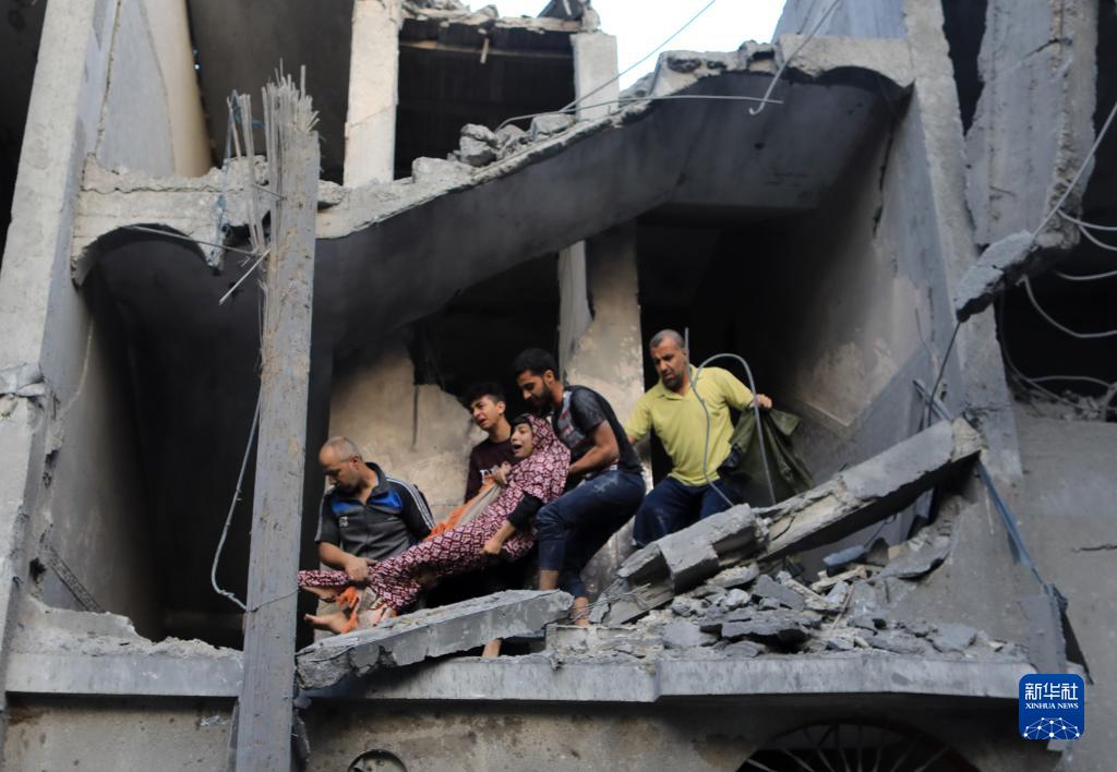 10月19日,在加沙地帶南部城市汗尤尼斯,人們在遭以色列空襲后的建筑廢墟中救援傷者。
