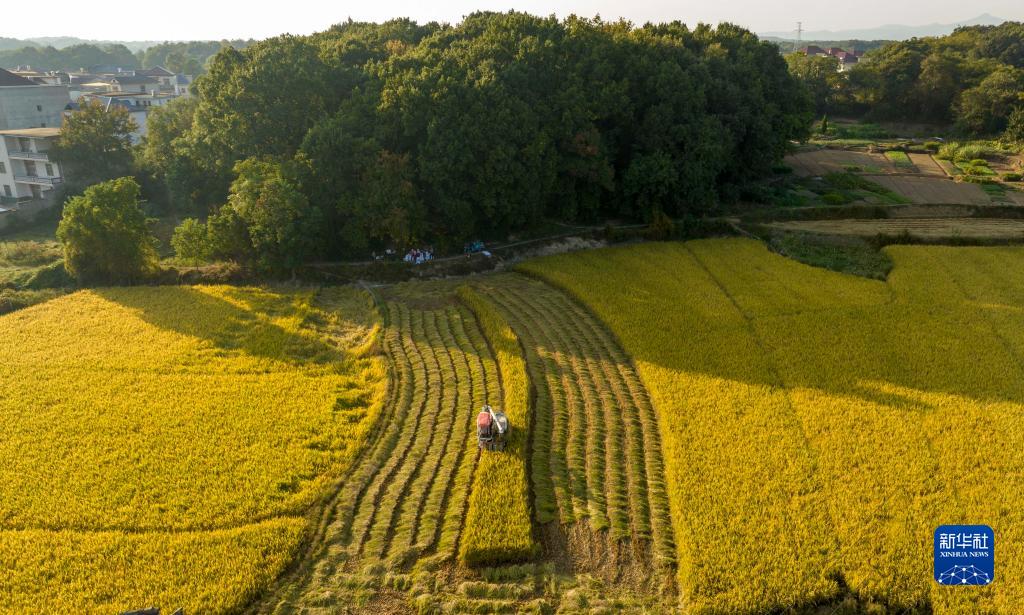 10月18日,在江西省九江市都昌縣汪墩鄉(xiāng)七星村,農(nóng)民駕駛農(nóng)機(jī)收割稻谷(無(wú)人機(jī)照片)。